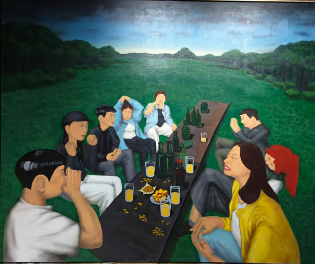 这幅画没有宏大的叙事,却用最日常的聚会场景,捕捉到了人与人之间最真实的联结——在自然的怀抱里,和朋友把酒言欢、肆意放松,是独属于青春与友谊的美好瞬间,充满了治愈的烟火气。