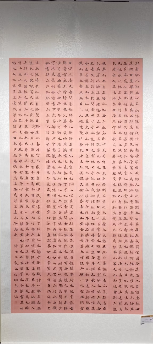 此幅楷书作品以唐代《法书论》为内容,通篇布局规整、气脉贯通,尽显端庄雍容的庙堂之气。笔法上融唐楷的雄健与唐墓志的朴厚,中锋行笔沉稳扎实,提按顿挫分明,起收严谨而不失灵动,线条刚劲饱满、力透纸背,兼具骨力与温润。结体宽博方正、疏密得宜,欹正相生间稳如泰山。