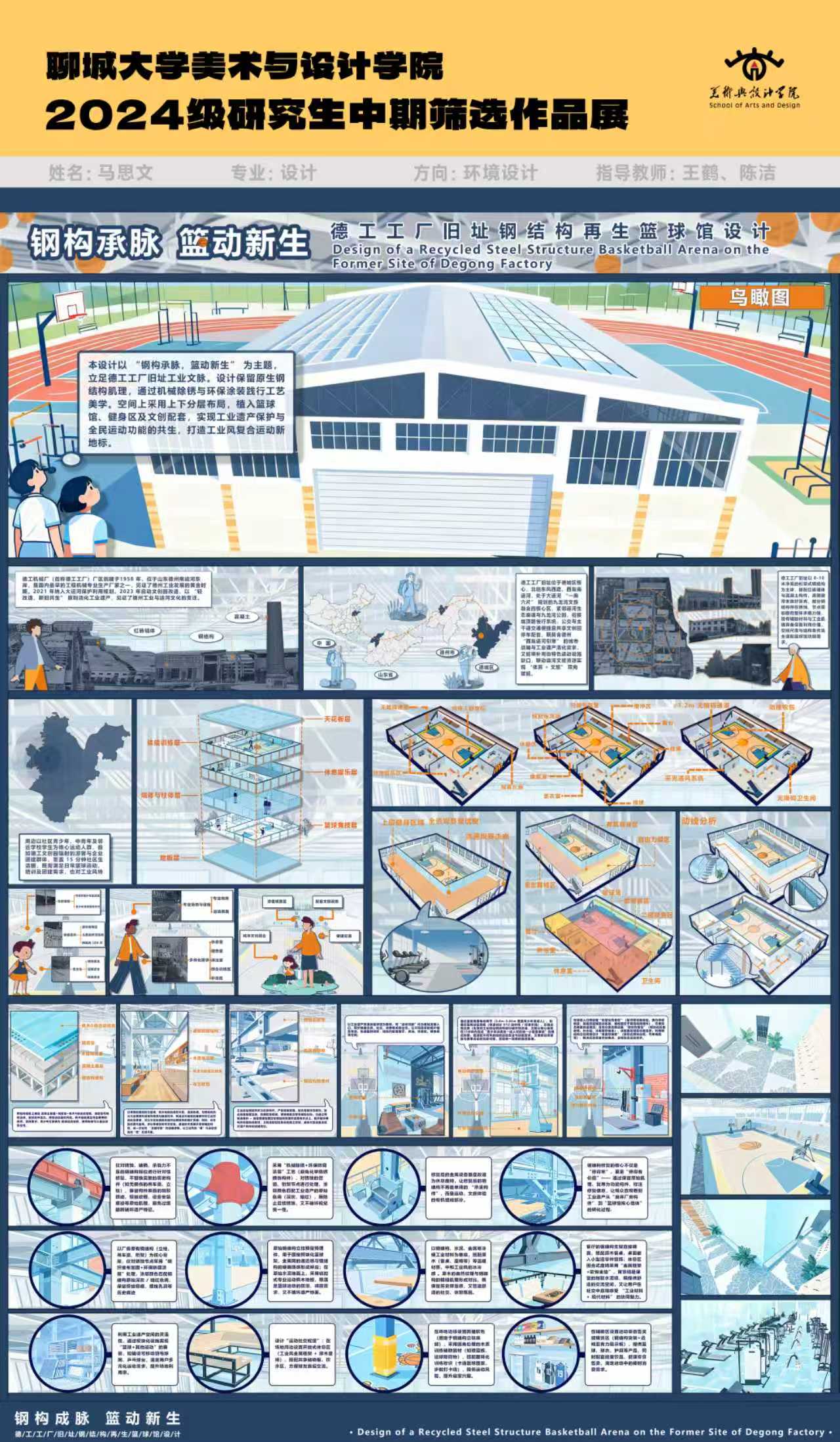 本设计以 "钢构承脉,篮动新生" 为主题,立足德工工厂旧址工业文脉。设计保留原生钢结构肌理,通过机械除锈与环保涂装践行工艺美学。空间上采用上下分层布局,植入篮球馆、健身区及文创配套,实现工业遗产保护与全民运动功能的共生,打造工业风复合运动新地标。