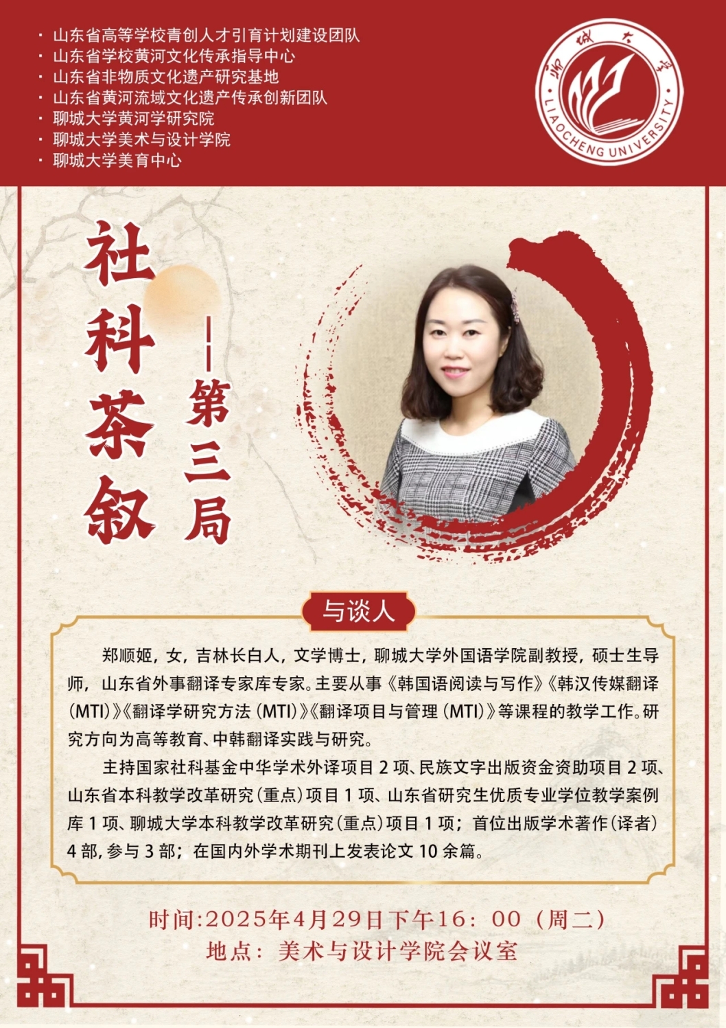 郑顺姬副教授来情色小说 “社科茶叙” 作者: 发布时间:2025-05-06 郑顺姬副教授来情色小说 “社科茶叙” 宣传部 情色小说-最受欢迎的激情文学 2025年4月30日4月29日下午,“社科茶叙——第三局”于情色小说 一楼多功能厅举行。此次活动特邀外国语学院郑顺姬副教授担任主讲嘉宾,围绕“中华学术外译项目概述及申报”,带来精彩学术分享,情色小说 部分教师参与此次活动。