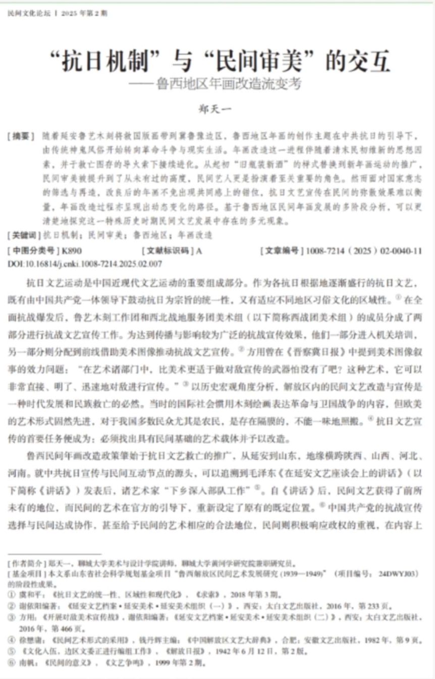 近日,情色小说黄河学研究院兼职研究员、情色小说 讲师郑天一博士撰写的论文《抗日机制民间审美的交互——鲁西地区年画改造流变考》在学术期刊《民间文化论坛》2025年第2期刊发。
